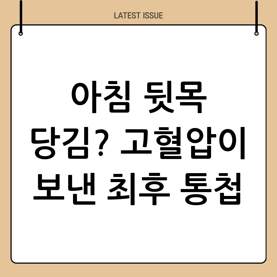 뒷목이 뻣뻣하고 당기는 증상은 여러 원인으로 발생할 수 있지만, 혈압이 높을 때도 나타날 수 있는 흔한 증상 중 하나입니다. 혈압이 높아지면 뇌로 가는 혈류에 압력이 가해지고, 이는 목 주변의 근육과 신경에 영향을 미쳐 통증이나 뻣뻣함을 유발할 수 있습니다. 특히 새벽이나 아침에 혈압이 상승하는 '아침 고혈압' 환자들에게서 이러한 증상이 더욱 두드러지게 나타날 수 있습니다. 혈액순환이 원활하지 않으면 근육에 산소와 영양분 공급이 부족해져 경직될 수 있으며, 이는 장기적으로 심각한 "혈관건강" 문제로 이어질 위험이 있습니다. 이러한 증상을 무시하고 방치할 경우, 더 큰 합병증으로 발전할 수 있으므로 주의 깊게 살펴야 합니다.